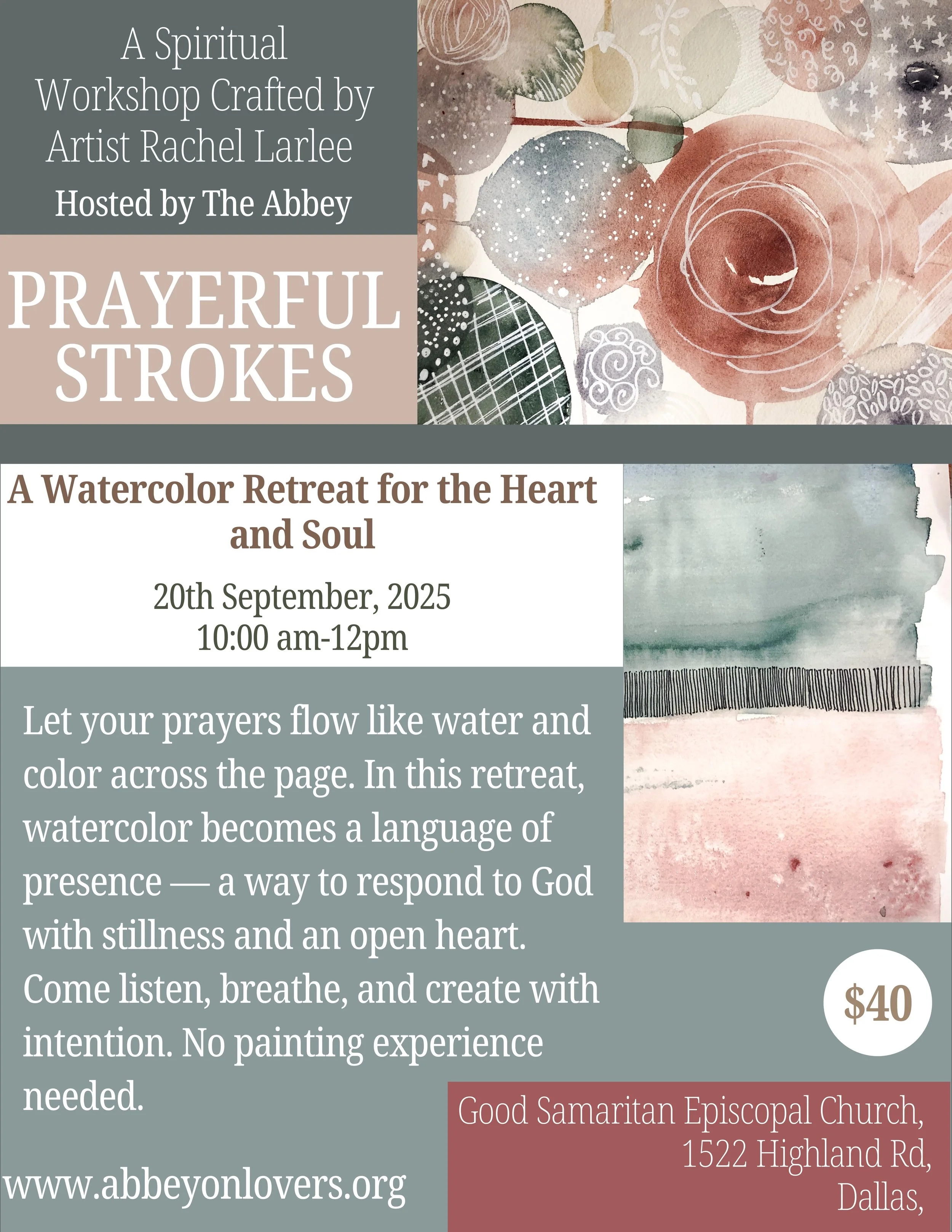 Prayerful Strokes: A Watercolor Retreat for the Heart and Soul: A spiritual workshop crafted by Artist Rachel Larlee and hosted by The Abbey in the City (formerly On Lovers Lane). Come and join Rachel as she helps us connect our art and faith.